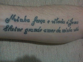 Outra tatuagem de Adriano homenageando a sua amada: "Minha Força e vitória é Jesus. Elaine grande amor da minha vida" |